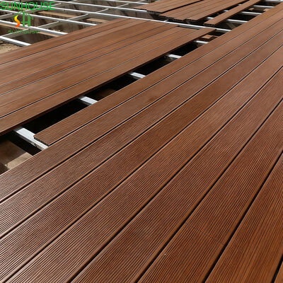 Tekstura powierzchni jest nakładana w trzyetapowym procesie wykończeniowym, łączącym wytłaczanie 3D, szlifowanie i szczotkowanie. To warstwowe podejście daje powierzchnię, która wizualnie i pod stopami przypomina naturalne drewno, z wystarczającą mikroteksturą, aby utrzymać przyczepność w mokrych warunkach. Żywica HDPE i stabilizatory UV są dodawane do masy deski przed wytłaczaniem — odporność na warunki atmosferyczne i stabilność koloru są wbudowane w strukturę materiału, a nie zależne od obróbki powierzchni, która z czasem ulega degradacji.
